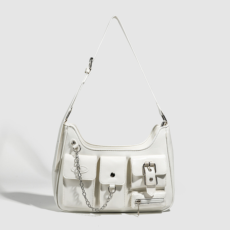 半小時前千禧辣妹甜酷多口袋機車斜挎鏈條包 - 白色