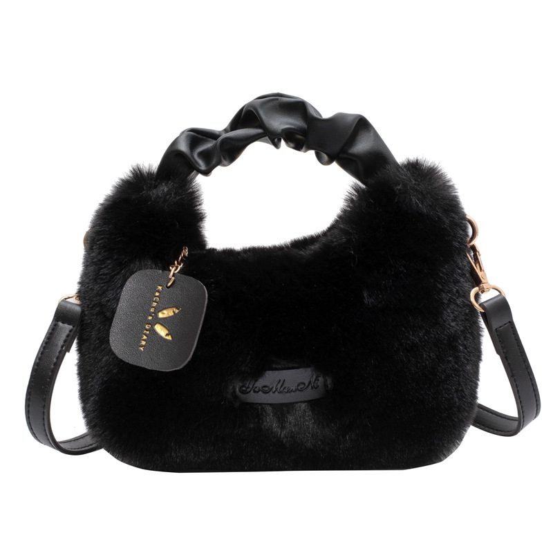 2分鐘前手提包褶皺毛絨包 - 黑色